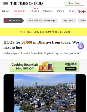 HCQS for 50,000 in Dharavi from today, Worli next in line Go to actual article You Might Also Like IAS officer third in state to get plasma therapy May 22, 2020 Dr. Udwadia. NY Post May 3, 2021 City toll hits 100 April 15, 2020 Mumbai: In U-turn, BMC says won’t use antimalarial as preventive drug April 17, 2020 Mumbai’s last stand as city nears its peak May 15, 2020