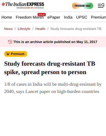 Study forecasts drug-resistant TB spike, spread person to person Go to actual article You Might Also Like Mumbai woman is India’s 1st to get lung transplant July 31, 2012 ‘In India, anyone and everyone treats TB’: Dr Zarir Udwadia October 18, 2016 Inside India: The Deadly Effects of Red Tape January 20, 2015 ‘India’s refusal to scale up bedaquiline is really the world’s problem’ – The Hindu January 8, 2017 A day in the life of India’s ‘tuberculosis warrior’ March 26, 2018
