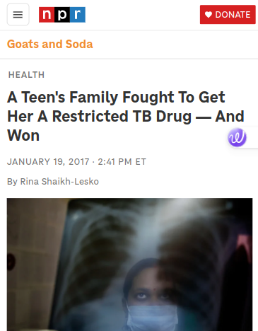 A Teen’s Family Fought To Get Her A Restricted TB Drug — And Won Go to actual article You Might Also Like Inside India: The Deadly Effects of Red Tape January 20, 2015 Corona update and publications by Dr Udwadia April 2, 2020 ‘In India, anyone and everyone treats TB’: Dr Zarir Udwadia October 18, 2016 WORLD TB DAY: The Big Battle To Kill The Killer March 26, 2018 Health Global Burden of Disease study: Here are the top 10 killers in India October 25, 2017